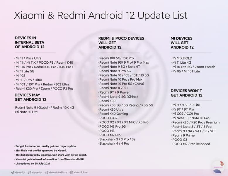 C включением Redmi K30 Pro и Poco F2 Pro перечень моделей Xiaomi, Redmi и Poco, для которых уже вышла тестовая версия Android 12, расширился до двадцати. Помимо Redmi K30 Pro и Poco F2 Pro в него также входят: Xiaomi Mi 11, Mi 11 Pro, Mi 11 Ultra, Mi 11i, Mi 11X, Poco F3, Redmi K40, Mi 11X Pro, Redmi K40 Pro, Redmi K40 Pro+, Mi 11 Lite 5G, Mi 10S, Mi 10, Mi 10 Pro, Mi 10 Ultra, Mi 10T, Mi 10T Pro, Redmi K30S Ultra.