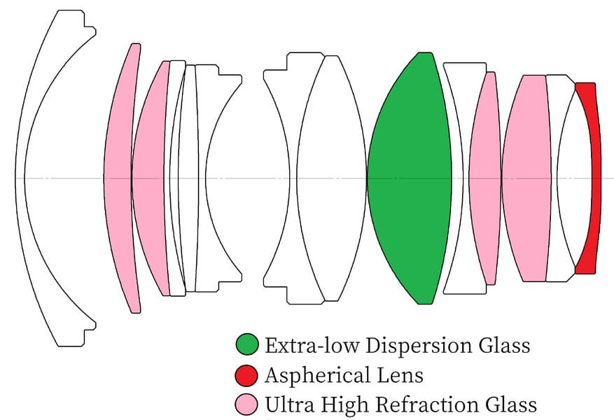 - оптическая схема — 14 элементов в 9 группах, включая асферический элемент, элемент ED и три элемента со сверхвысоким коэффициентом преломления;