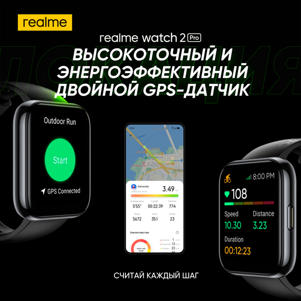 Умные часы Realme Watch 2 Pro оснащены дисплеем диагональю 1,75 дюйма, разрешением 320 x 285 пикселей. Они также являются водонепроницаемыми и соответствуют степени защиты IP68. Ёмкость аккумулятора составляет 390 мА•ч — его хватает на 14 дней использования в обычном режиме. Устройство оснащено оптическим датчиком частоты сердечных сокращений, а также возможностью отслеживания уровня кислорода в крови. Realme Watch 2 Pro позволяют контролировать продолжительность и качество сна, подсчитывать шаги, пройденное расстояние, потреблённые калории и многое другое. Также они оснащены модулем GPS и поддерживают 90 различных спортивных режимов, среди которых: бег на свежем воздухе, ходьба, футбол, баскетбол, бадминтон, скакалка и так далее.