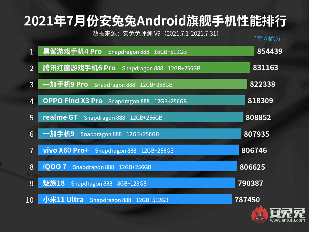 Места с четвёртого по десятое заняли Oppo Find X3 Pro, Realme GT, OnePlus 9, Vivo X60 Pro+, iQOO 7, Meizu 18 и Xiaomi Mi 11 Ultra. Несмотря на то, что все смартфоны получили флагманскую платформу Snapdragon 888, разрыв между первым и десятым местом составляет около 67 тысяч баллов.