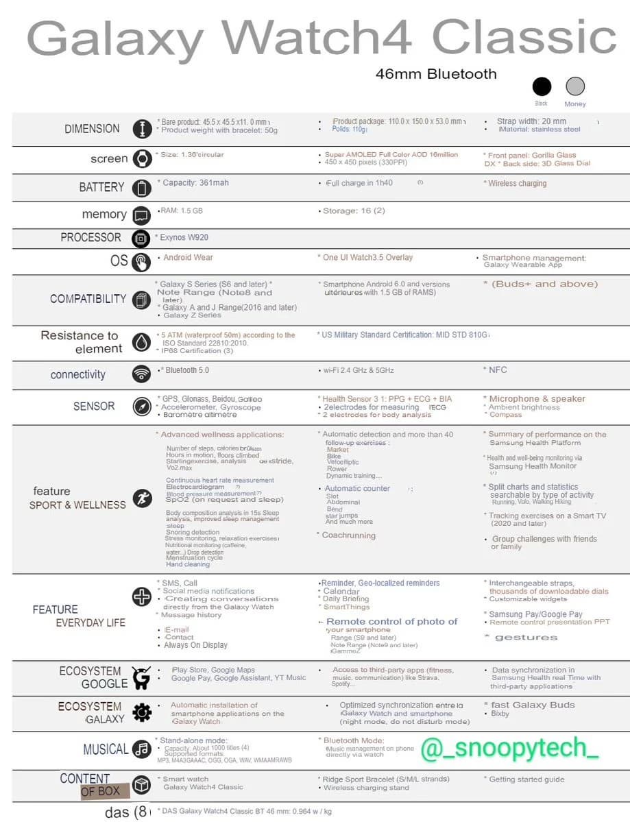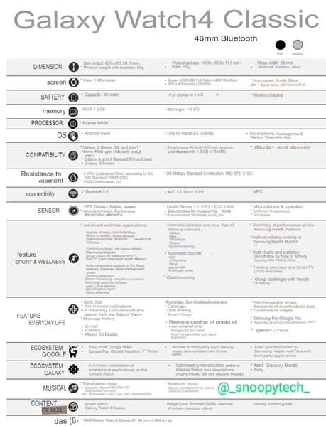 Вчера мы ознакомились с основными характеристиками умных часов Samsung Galaxy Watch4, а сегодня в Сеть попала таблица с полным описанием всех параметров и функций этого устройства.
