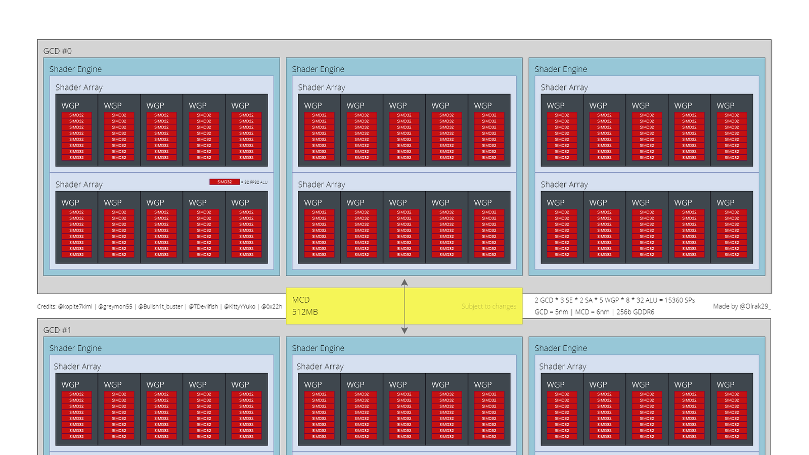 Как и говорилось ранее, Navi 31 и Navi 32 являются двухчиповыми GPU. В первом случае, согласно имеющимся данным, графический процессор содержит 60 блоков WGP с 15 360 потоковыми процессорами, а во втором — блоков уже 40, что говорит о наличии 10 240 потоковых процессоров.