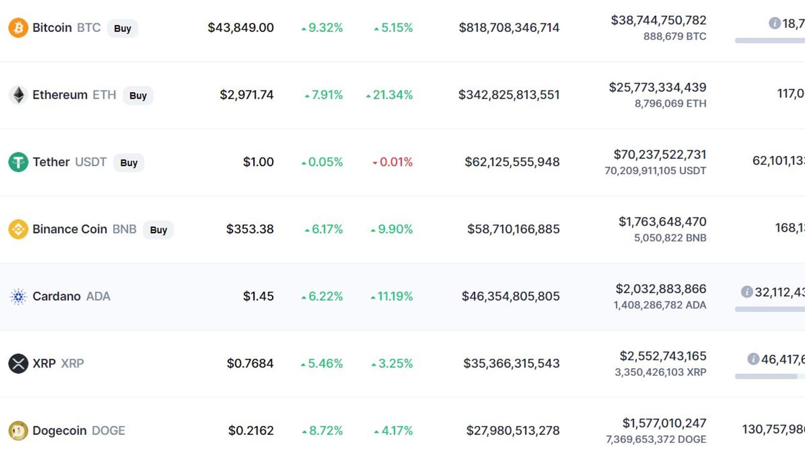 Ethereum тоже растет. За семь дней она прибавила более 20%, а за последние сутки – более 7%. В Итоге за 1 ETH сейчас дают более 2950 долларов. Еще чуть-чуть, и стоимость Ethereum перевалит за 3000 долларов. Все остальные криптовалюты из Топ-10 тоже окрашены в зеленый цвет. А больше всего за истекшую неделю прибавила Polkadot – более 30%.