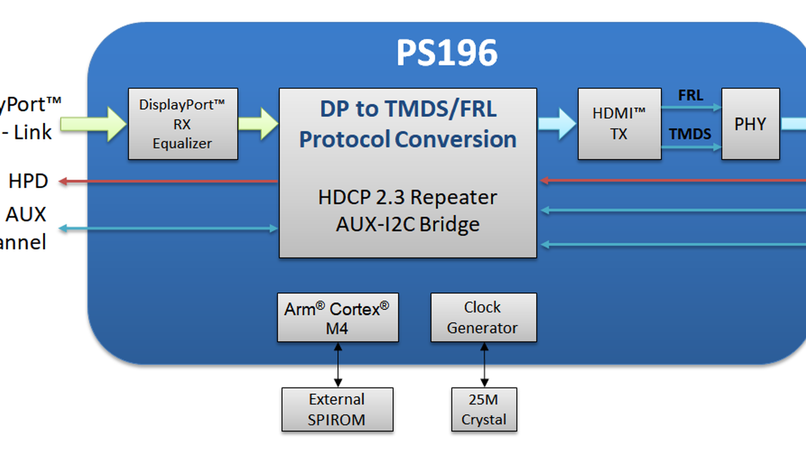 Конверторы PS195 и PS196 полностью соответствуют спецификациям VESA DisplayPort v2.0 и HDMI v2.1. Приемник DP поддерживает до 4 полос на скорости канала HBR3 (8,1 Гбит/с) и дополнительное сжатие DSC, как при декодировании входа DP, так и при передаче на выход HDMI. Выход HDMI поддерживает до 4 полос FRL со скоростью передачи данных 12 Гбит/с на полосу, что позволяет поддерживать разрешение до 10K при использовании сквозной передачи DSC. Выход HDMI также обеспечивает обратную совместимость с HDMI 2.0 и более ранними версиями, обеспечивая передачу сигналов TMDS со скоростью до 6,0 Гбит/с. Кроме того, поддерживаются такие возможности, как Variable Refresh Rate (VRR), Quick Media Switching (QMS) и Auto Low Latency Mode (ALLM).
