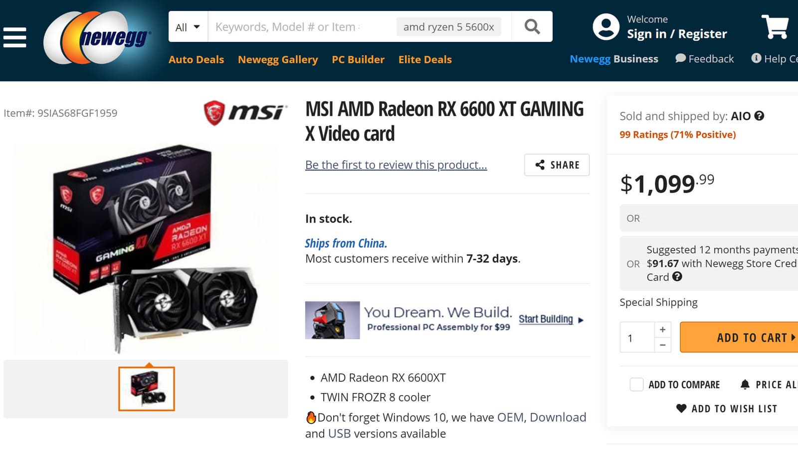 Это карта MSI Radeon RX 6600 XT Gaming X с ценой... 1100 долларов. Карта якобы присутствует в наличии, но продавцом является не сама компания NewEgg, а некий сторонний продавец, обещающий доставить карту за 7-32 дня.