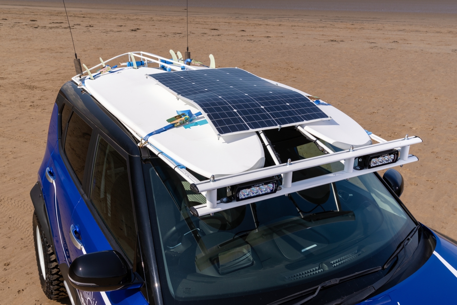 Одна из наиболее ярких особенностей — изготовленный на заказ стальной багажник на крыше, где можно разместить пару досок для серфинга. Общая высота автомобиля с установленными досками составляет 1950 мм — на 255 мм выше, чем у Kia Sorento, самого большого автомобиля, который Kia продает в Великобритании.