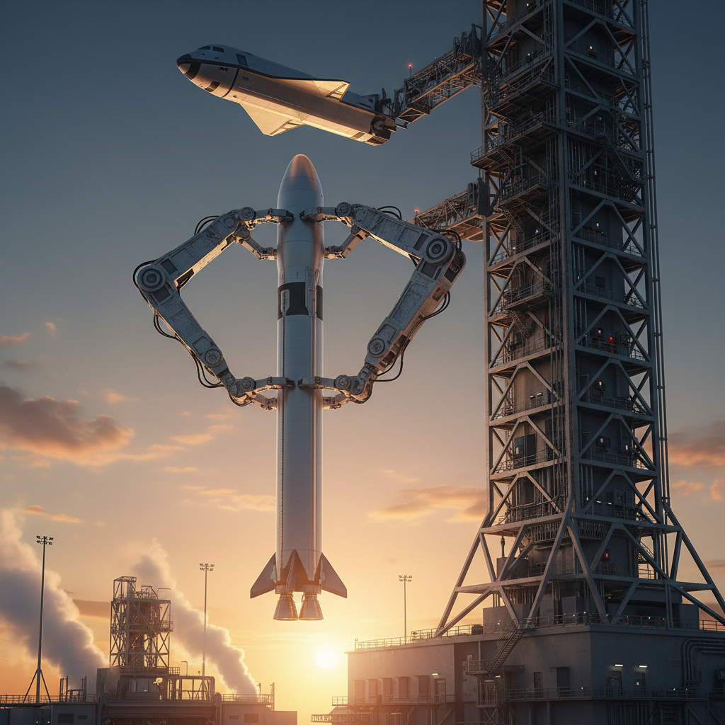 Для того чтобы «поймать» Space Heavy и установить ракету-носитель точно на место дозаправки и установки следующего модуля Starship, будет использоваться гигантская башня с механизированной рукой под названием Mechazilla. Вся процедура должна занимать не более часа.