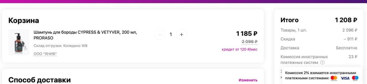 Пресс-служба Wildberries подаёт новшество как «снижение цен на товары при оплате через российские платежные системы». Однако на самом деле компания ввела комиссию при оплате с помощью зарубежных платёжных систем, таких как Visa и Masterсard. Комиссия составляет 2%.