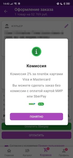 Как мы видим на скриншотах, в мобильном приложении и веб-версии Wildberries цена товара не меняется. В зависимости от выбранного метода оплаты покупатель либо платит дополнительную комиссию (Visa и Masterсard), либо нет («Мир», СБП и SberPay).