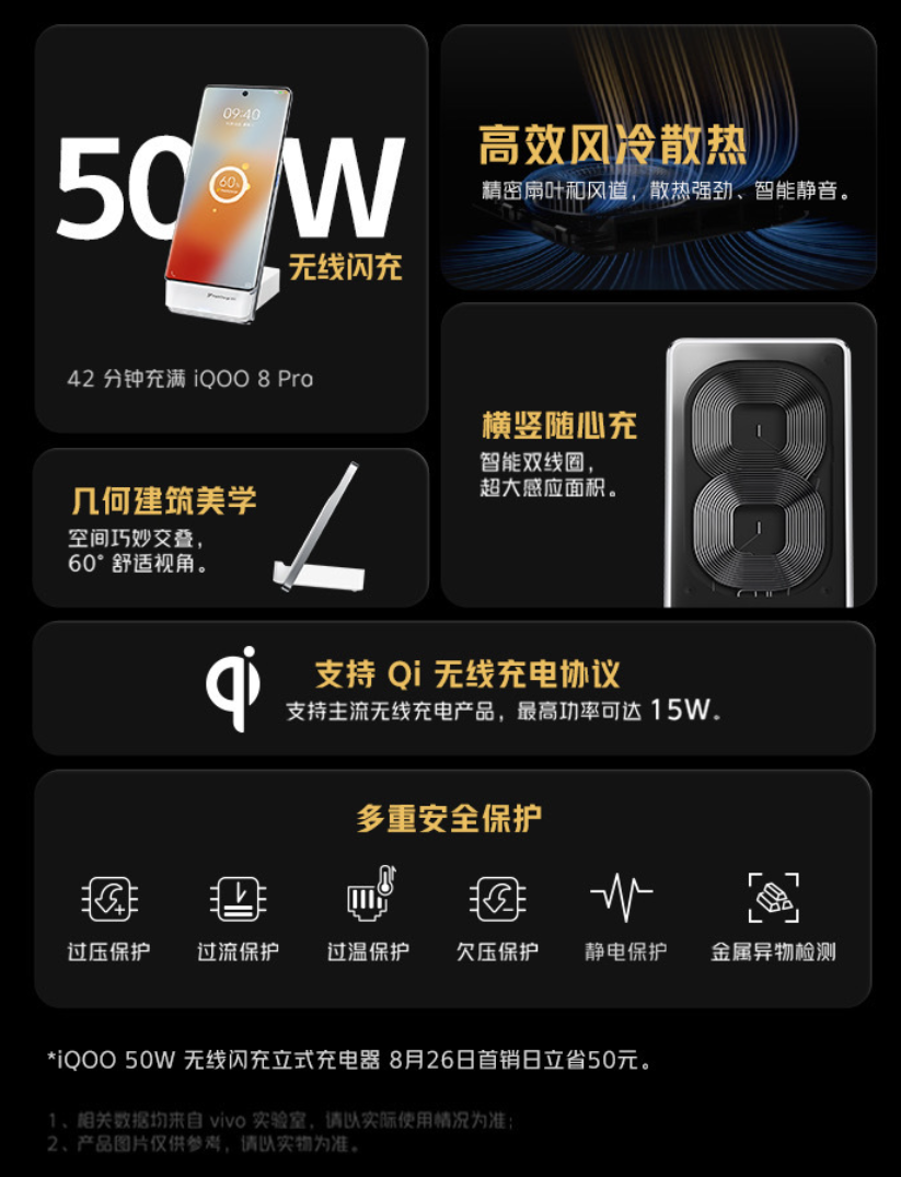 Вчера бренд iQOO представил свой флагманский смартфон iQOO 8 Pro с поддержкой беспроводной зарядки мощностью 50 Вт, а практически сразу после этого дебютировало и фирменное беспроводное зарядное устройство. Вертикальная беспроводная зарядка обеспечивает мощность 50 Вт – с ее помощью iQOO 8 Pro, оснащенный аккумулятором емкостью 4500 мА·ч, полностью заряжается за 42 минуты.