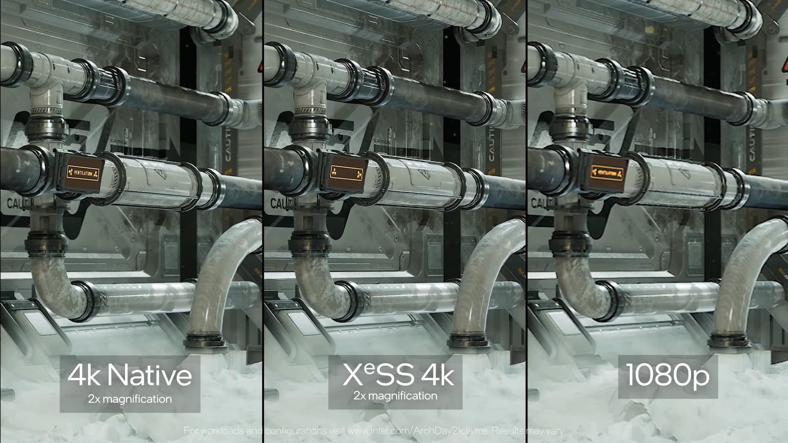 Intel показала короткую демонстрацию, где технология XeSS якобы позволяла повысить производительность вдвое в разрешении 4K. При этом счётчика fps не было. Но зато было видно, как технология может улучшить картинку при апскейле с Full HD до 4K.