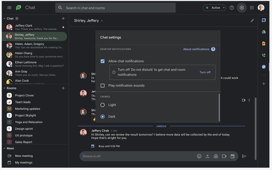 Компания Google объявила о распространении тёмного режима в Google Chat для ПК (веб-версия и Progressive Web App). Теперь ещё один сервис поискового гиганта обеспечивает комфортное использование в условиях низкой освещённости.