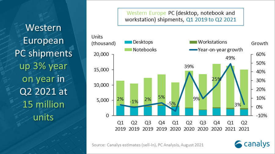 По данным аналитической компании Canalys, во втором квартале 2021 года в Западной Европе было продано 15,0 млн персональных компьютеров, к которым в Canalys относят настольные компьютеры, ноутбуки и рабочие станции. Это на 3% больше по сравнению с аналогичным периодом прошлого года. Хотя на протяжении четырёх предыдущих кварталов рост был значительно больше, эксперты напоминают, что рост зафиксирован по сравнению с «феноменальным» вторым кварталом прошлого года, так что он очень впечатляет.