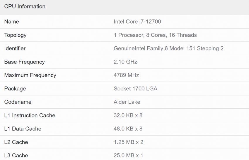 В бенчмарке Geekbench засветился новый процессор Intel маячащей на горизонте серии Alder Lake — Intel Core i7-12700. Отсутствие буквы К в названии указывает на отсутствие поддержки разгона, но в то же время есть и другая особенность — у Core i7-12700 нет деления на малые и большие ядра, характерного для некоторых представителей семейства. У него только большие ядра в количестве 8 штук, отсюда и поддержка выполнения 16 потоков одновременно.