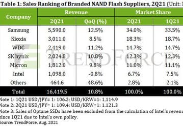 Выручка производителей флеш-памяти NAND во втором квартале TrendForce выросла на 10,8%