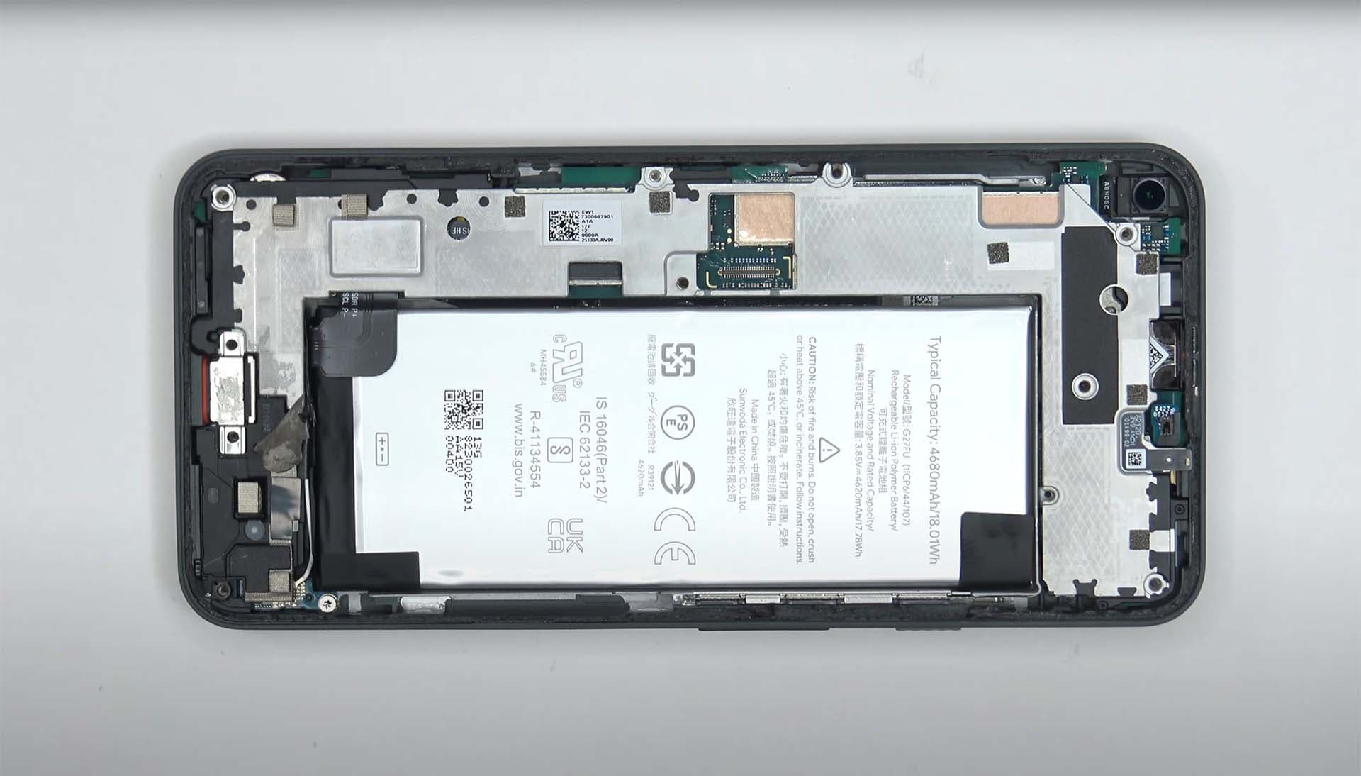 По периметру смартфон покрыт клеящим веществом, которое придётся разогреть, чтобы снять экран, а затем нанести новый слой, чтобы вернуть экран на место. Сняв дисплей, пользователь получает доступ к внушительной батарее ёмкостью 4680 мА·ч, которая покрыта чёрной графеновой пленкой.