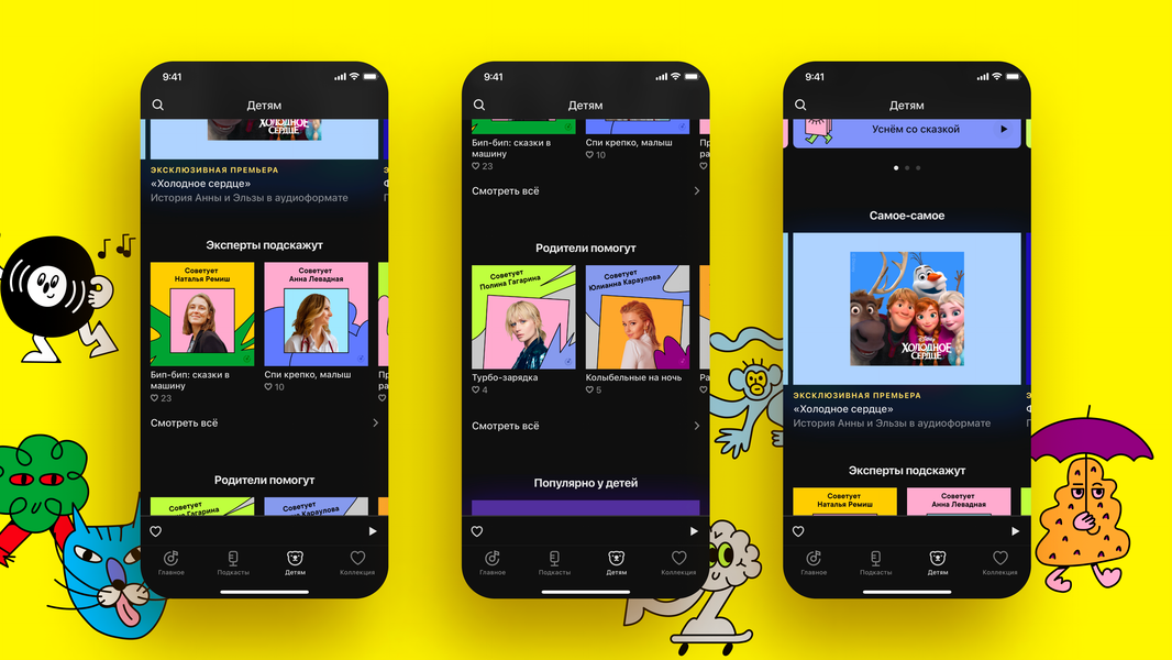 Также есть специальные подборки — от экспертов в области детской медицины, литературы и воспитания. Как полагают разработчики, родителям сервис должен помочь укладывать детей спать, облегчать сборы в детский сад, развлекать ребёнка во время долгой дороги. Для всех этих ситуаций предусмотрены плейлисты и аудиопотоки с персональными рекомендациями.