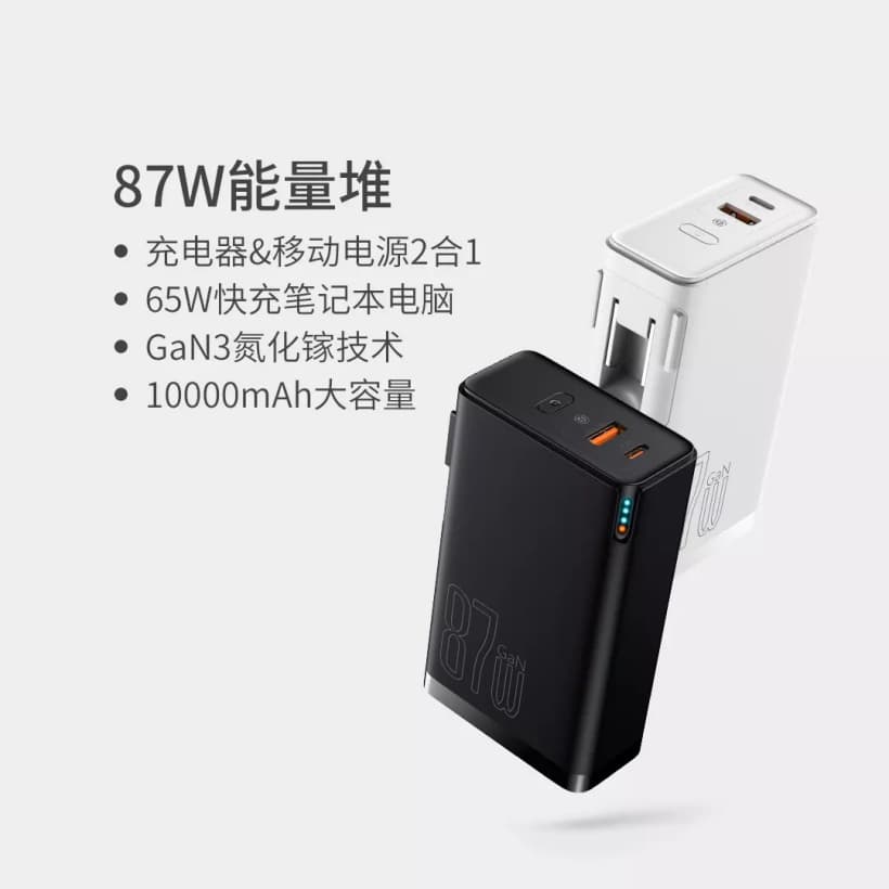 Ассортимент Baseus пополнился устройством, которое может пригодиться многим владельцам гаджетов. Инженеры компании в одном корпусе уместили и зарядный блок с нитридом галлия (GaN) мощностью 87 Вт, и мобильный аккумулятор емкостью 10 000 мА·ч.