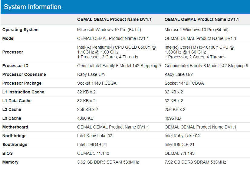 Базовый вариант Surface Go 3 предполагает наличие процессора Pentium Gold 6500Y, соединенного с 4 ГБ оперативной памяти DDR3. Вариант помощнее – с процессором Core i3-10100Y и 8 ГБ ОЗУ. Оба CPU относятся к семейству Amber Lake Y и обеспечивают примерно одинаковую производительность несмотря на принадлежность к разным сериям. Так, версия Core i3 быстрее версии с CPU Pentium всего на 4% в однопоточном тесте и на 11% – в многопоточном.