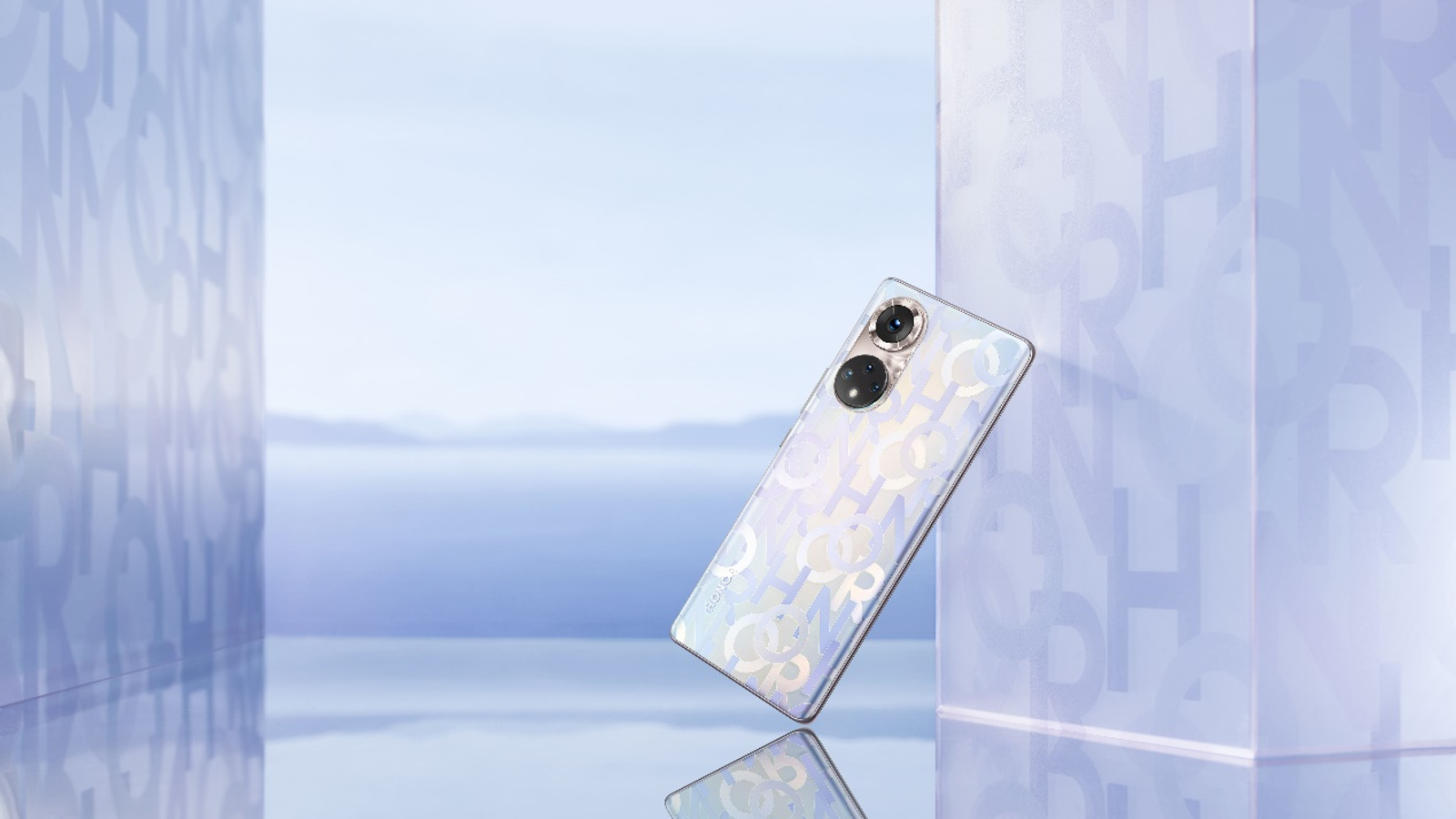 Весь корпус Honor 50 в цвете Honor Code украшен буквами из названия компании, которые расположены в хаотичном порядке. При этом создаётся впечатление, что буквы расположены на разной глубине. Задняя панель является градиентной и переливается разными оттенками под разными углами. Кроме того, на задней крышке используется матовое стекло с другими тактильными ощущениями.