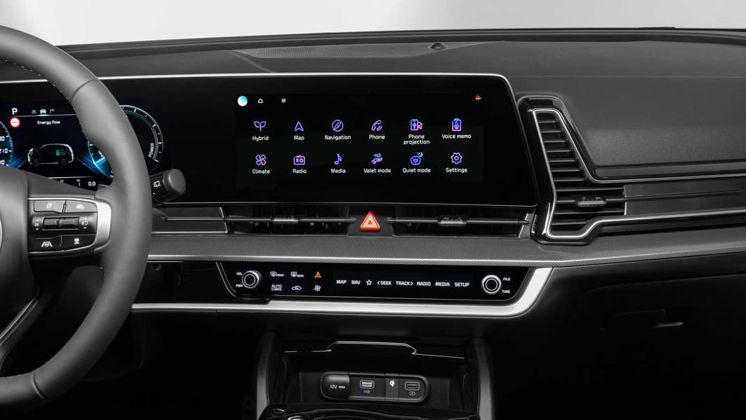 Мультимедийная система и панель приборов представлены на двух 12,3-дюймовых экранах (ранее выпущенная версия оснащена 10,25-дюймовыми экранами). Есть место для беспроводной зарядки смартфона мощностью 15 Вт. Вы можете подключаться к автомобилю со смартфона через приложение Kia Connect, получая доступ к сервисам, навигации, управлению голосом и так далее.