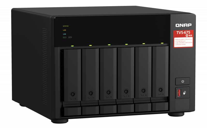 Хранилище рассчитано на накопители типоразмера 2,5 или 3,5 дюйма с интерфейсом SATA 6 Гбит/с. Поддерживается горячая замена. Конфигурация NAS включает 8 ГБ памяти DDR4 с возможностью расширения до 64 ГБ. Модули памяти SODIMM устанавливаются в два слота. Кроме того, есть два слота PCIe Gen 3 x 4, куда можно установить карты расширения, например сетевые карты с портами 5GbE или 10GbE. Выход HDMI 2.0 позволяет напрямую отображать мультимедийные данные и рабочие столы виртуальных машин NAS на мониторе или телевизоре. Работает TVS-675 под управлением операционной системы с QTS на QuTS hero. Завершает картину пара портов USB 3.2 Gen 2 (10 Гбит/с) и пара портов USB 3.2 Gen 1 (5 Гбит/с).