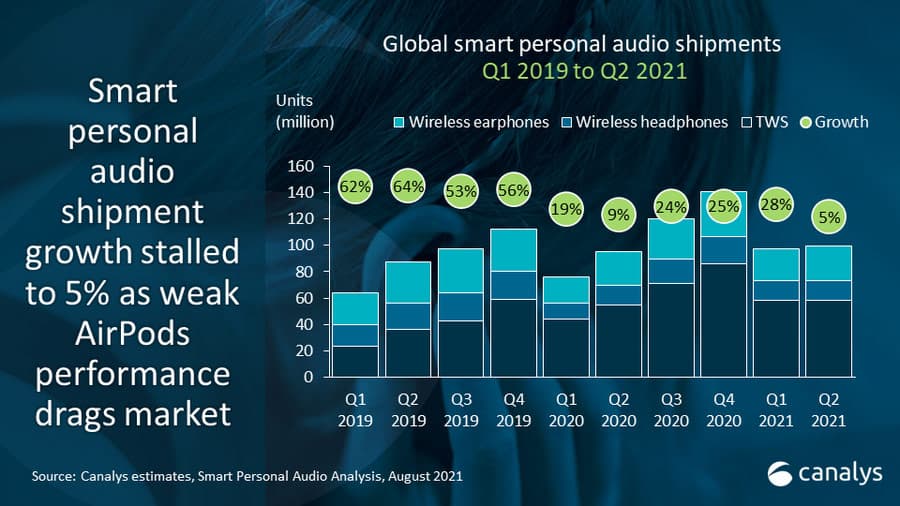 Специалисты аналитической компании Canalys подвели итоги второго квартала 2021 года на рынке полностью беспроводных наушников (true wireless stereo или TWS). Напомним, так называют модели, в которых провод отсутствует не только между наушниками и источником, но и между левым и правым наушниками.