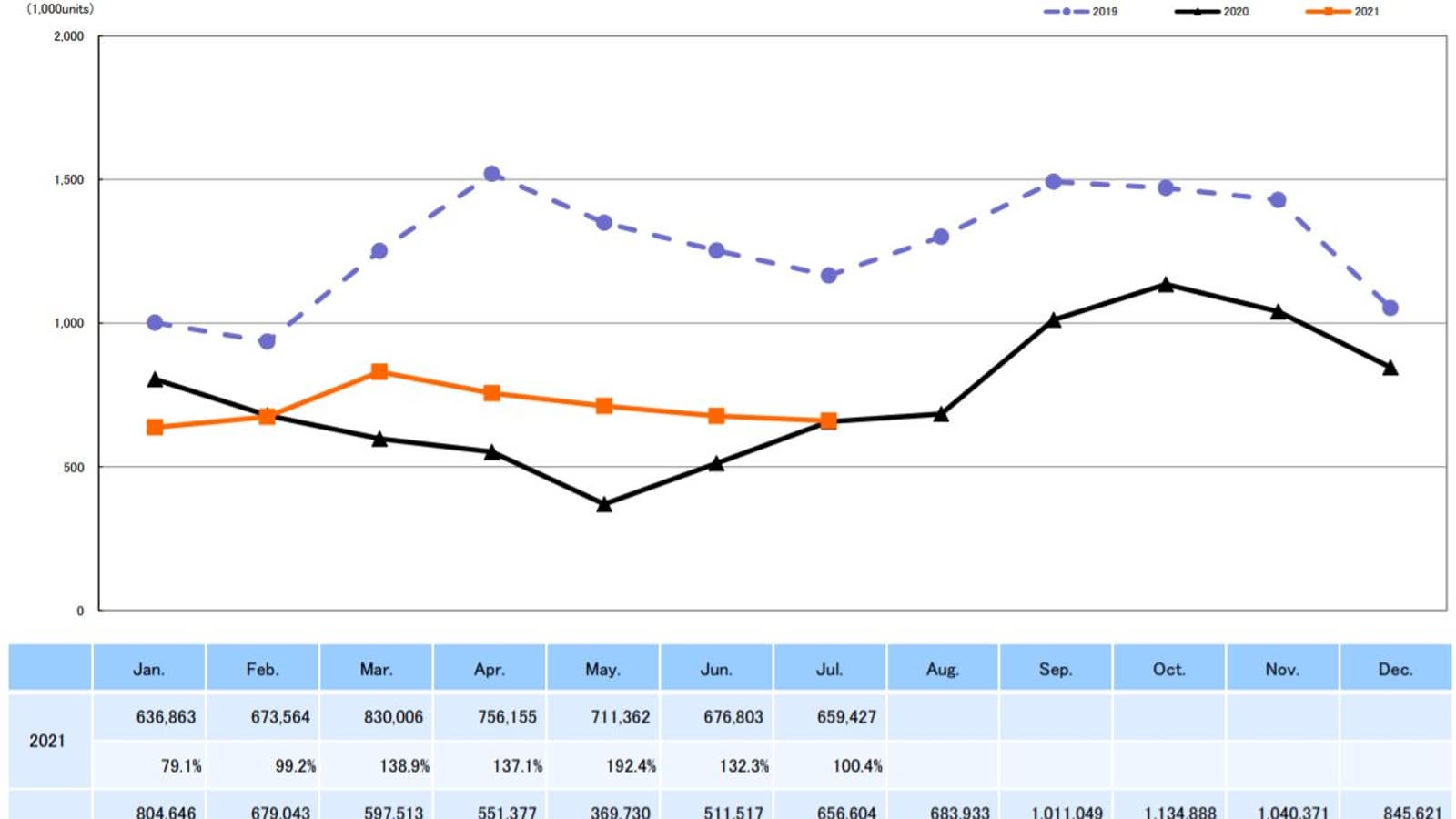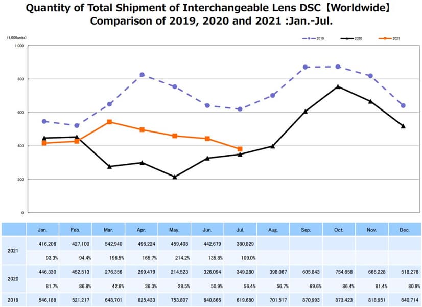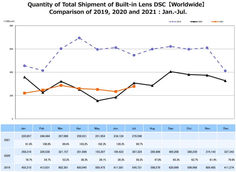 Всего за июль было продано 659 427 цифровых камер, что всего на 0,4% больше, чем в июле 2020 года, когда было продано 656 604 камеры.