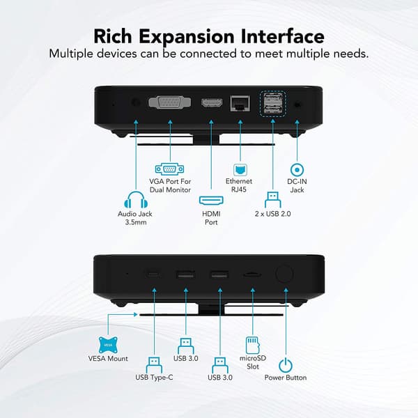 В оснащение мини-ПК входят беспроводные интерфейсы Wi-Fi (2,4 и 5 ГГц) и Bluetooth 4.2, два порта USB 2.0, три порта USB следующего поколения, один из которых выведен на разъём USB-C, порт Gigabit Ethernet и видеовыходы VGA и HDMI.