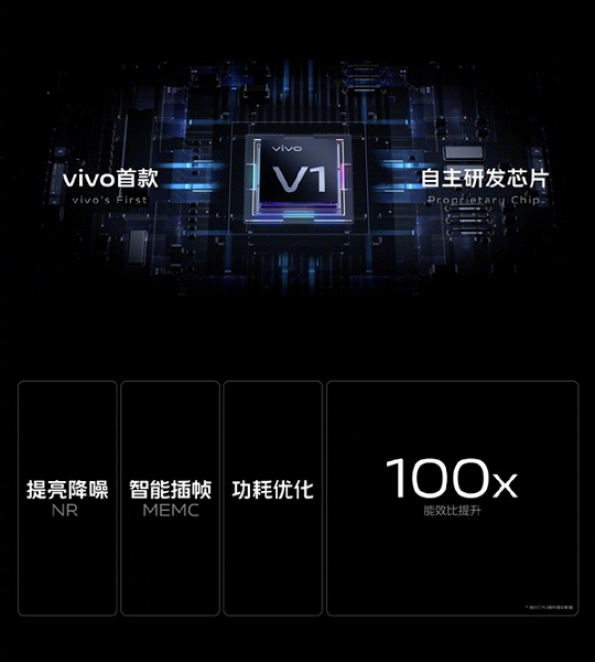 Vivo X70 — первые смартфоны бренда с собственным процессором изображения Vivo V1. Он обеспечивает работу системы интеллектуального шумоподавления и технологии MEMC, приспособленной специально для более плавной картинки при захвате видео. При этом гарантируется более низкое энергопотребление, в сравнении с DSP однокристальной платформы. V1 позволяет улучшить ночную фото- и видеосъёмку, но он установлен только в топовых моделях — X70 Pro и X70 Pro+.