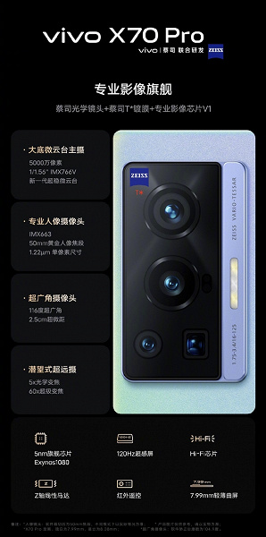 В X70 Pro уже четыре модуля: 50 Мп (Sony IMX766V, широкоугольный объектив и осевой стабилизатор), 12 Мп (Sony IMS663, оптическая стабилизация, портретный объектив, 2-кратный оптический зум), 12 Мп (сверхширокоугольный объектив с углом обзора 120°), 8 Мп (перископный модуль, 5-кратный оптический зум, оптическая стабилизация).