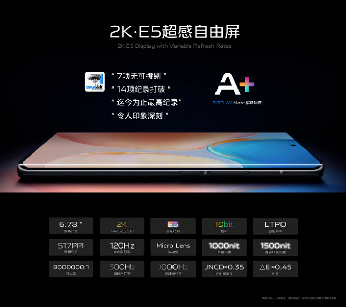 Vivo X70 Pro+ получил лучший дисплей в отрасли — Samsung AMOLED последнего поколения E5 (в большинстве нынешних флагманов, в том числе и Galaxy S21 Ultra, используется панель E3). Экран производится по технологии LTPO, он энергоэффективнее панелей LTPS, к тому же позволяет регулировать кадровую частоту в пределах от 1 до 120 Гц с шагом в 1 Гц. Матрица характеризуется диагональю 6,78 дюйма и разрешением 3200 х 1440 пикселей.