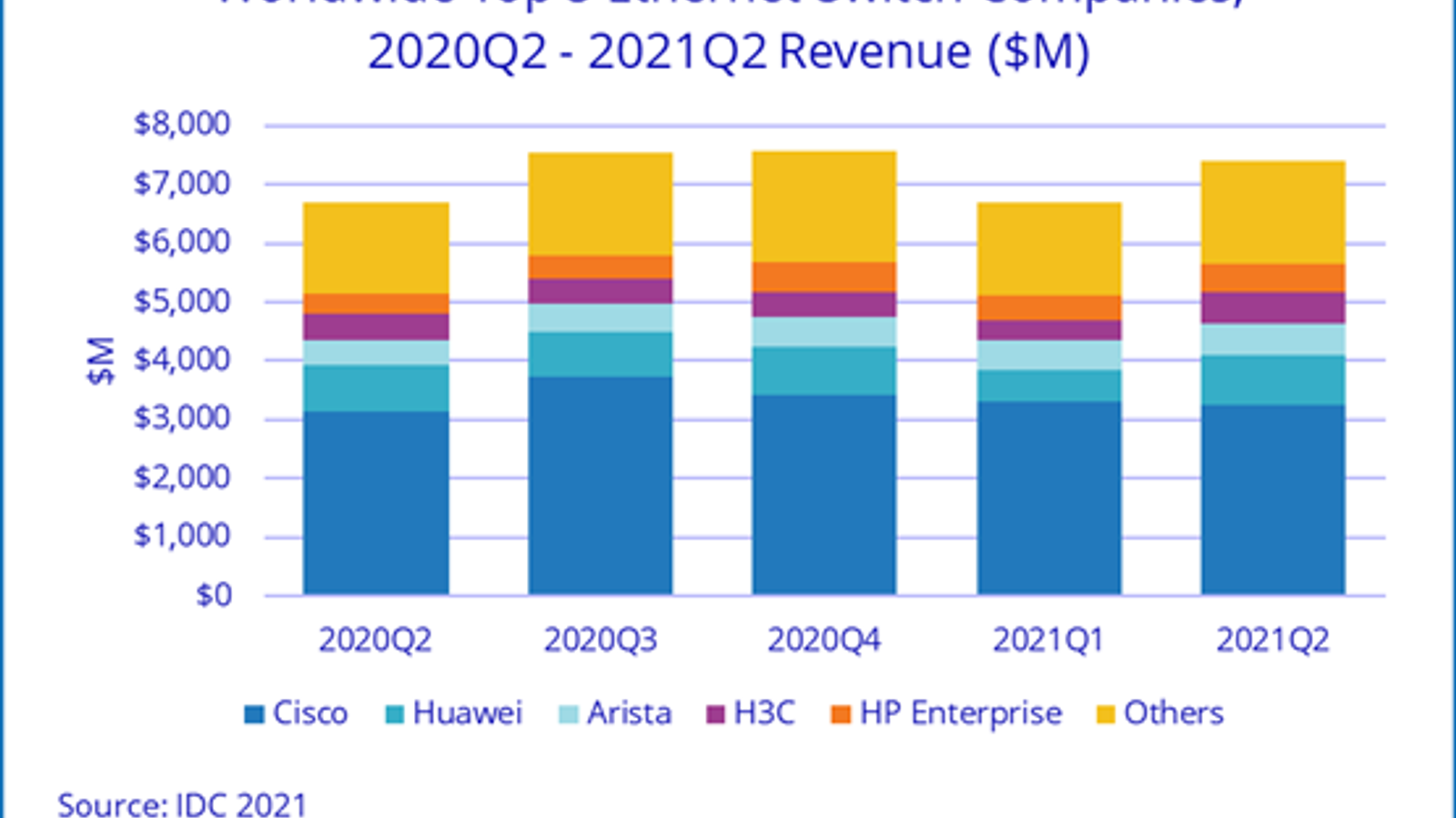 Специалисты аналитической компании IDC подвели итоги второго квартала 2021 года не только на рынке внешних систем хранения данных, но и на рынке коммутаторов Ethernet и маршрутизаторов корпоративного уровня. Согласно их подсчётам, продажи коммутаторов достигли 7,4 млрд долларов. Этот показатель на 10,8% больше показателя за второй квартал 2020 года. Продажи маршрутизаторов корпоративного уровня в годовом выражении уменьшились на 0,5%, до 3,9 млрд долларов.