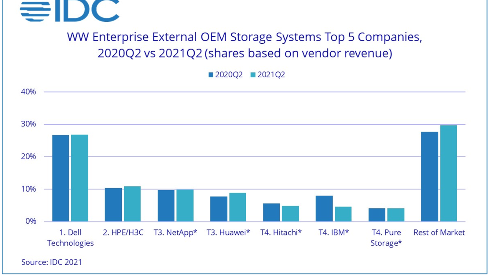 Специалисты аналитической компании IDC подвели итоги второго квартала 2021 года на рынке внешних систем хранения данных. По подсчётам аналитиков, выручка OEM-производителей, поставляющих эту продукцию, в годовом выражении выросла на 9,7% и достигла 6,9 млрд долларов. Примечательно, что суммарный объём хранилищ, отгруженных за квартал, по сравнению с аналогичным периодом прошлого года вырос на 27,9% и достиг 22,1 эксабайт.