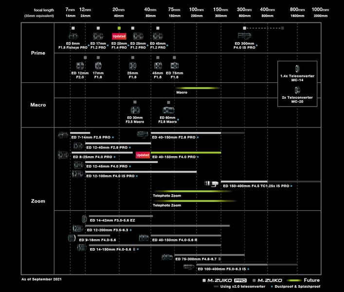 Компания OM Digital Solutions, в январе этого года созданная на базе бывшего подразделения Olympus по выпуску фототехники его новым владельцем, фондом Japan Industrial Partners (JIP), объявила о разработке двух новых объективов системы Micro Four Thirds. Модели M.Zuiko Digital ED 20mm F1.4 PRO и M.Zuiko Digital ED 40–150mm F4.0 PRO дополнили наглядное представление текущего каталога объективов и планов компании. На графике есть ещё три будущих объектива: макрообъектив с фокусным расстоянием около 100 мм и два телеобъектива с переменным фокусным расстоянием в диапазоне примерно 50–200 мм. Никакой информации о новых объективах, включая спецификации, сроки выпуска и цены, пока нет.