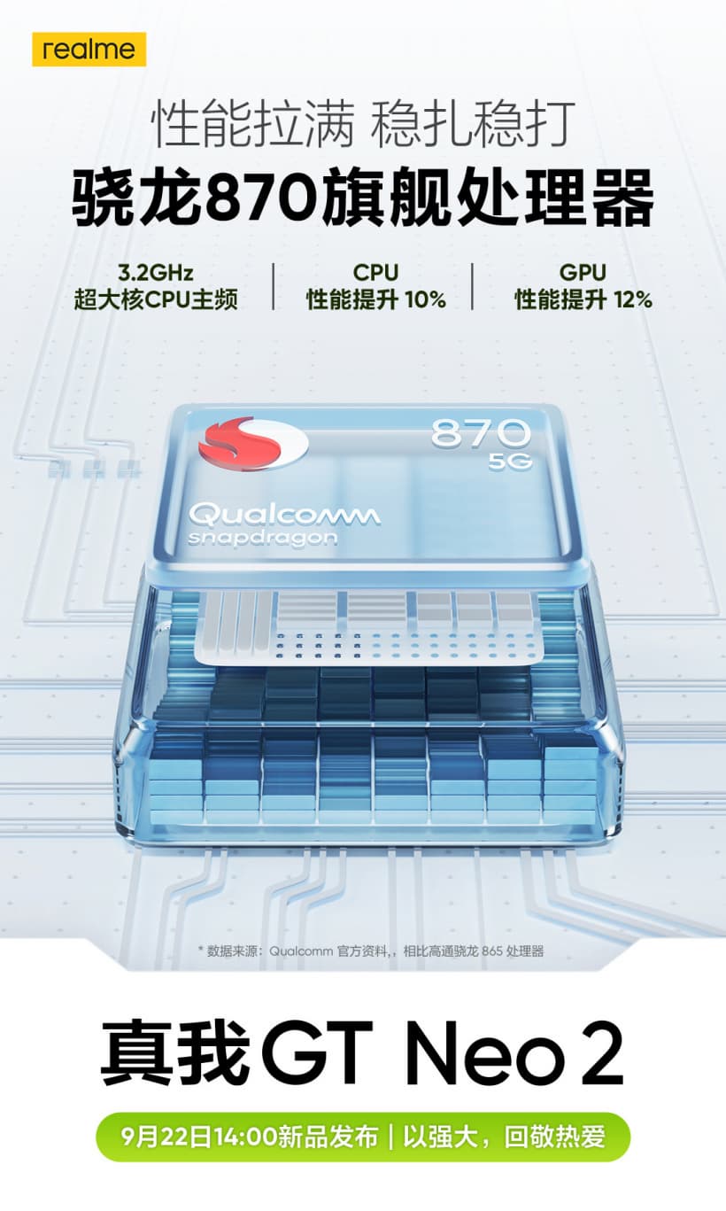 Офциальная премьера Realme GT Neo 2 состоится 22 сентября. Смартфон также получит дисплей AMOLED диагональю 6,62 дюйма с кадровой частотой 120 Гц и тройную камеру с датчиками разрешением 64, 8 и 2 Мп.