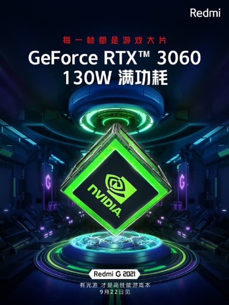 Вслед за первым тизером игрового ноутбука Redmi G 2021, дебютирующего 22 сентября, появился и второй, более информативный. Изображение указывает, что лэптоп получит dGPU Nvidia GeForce RTX 3060, причем полнофункциональный — потребляющий до 130 Вт.