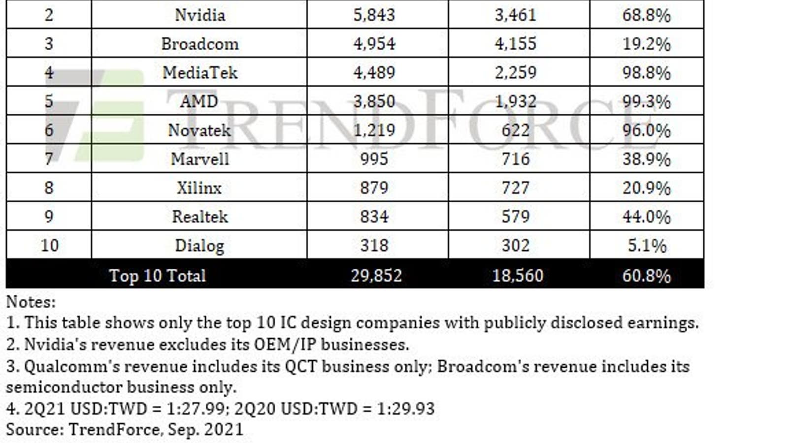 Согласно последним исследованиям TrendForce, ввиду продолжающейся нехватки производственных мощностей в полупроводниковой промышленности и связанного с этим роста цен на микросхемы, выручка десяти ведущих разработчиков микросхем во втором квартале 2021 года достигла 29,8 млрд долларов. Этот показатель вырос в годовом выражении на 60,8%. В частности, впечатляющий рост — более чем на 95% — продемонстрировали тайваньские компании MediaTek и Novatek. А наибольший результат в первой десятке показала компания AMD. Её выручка за год увеличилась почти на 100%.