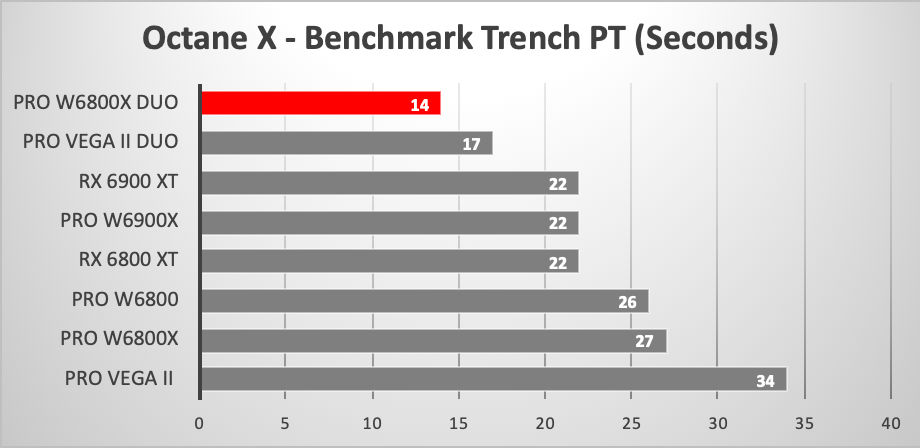 Само собой, тесты подтверждают огромную производительность такого решения. В Octane X видеокарта как раз примерно вдвое быстрее одинарной Radeon Pro W6800X, а топовая одночиповая Radeon Pro W6900X отстаёт более чем наполовину. Также для сравнения можно привести результаты Nvidia RTX A6000 (16 секунд) и GeForce RTX 3090 (15,2 секунды). Правда, такое сравнение весьма условное, так как адаптеры Nvidia в любом случае недоступны владельцам Mac Pro.