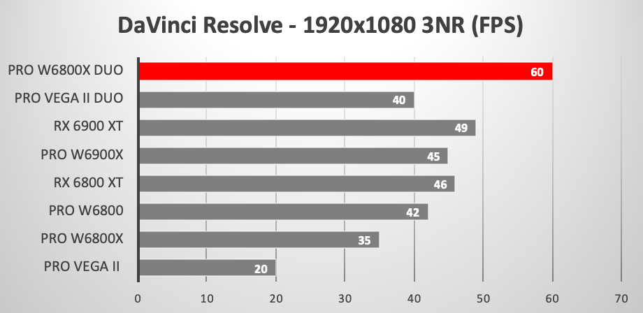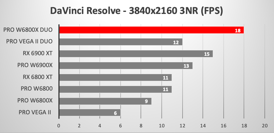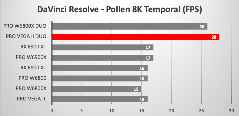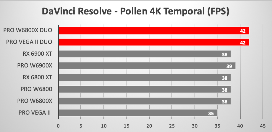 В тестах DaVinci новинка также ощутимо превосходит любую одночиповую карту, правда, в паре тестов либо равняется, либо даже уступает двухчиповой Radeon Pro Vega Duo.