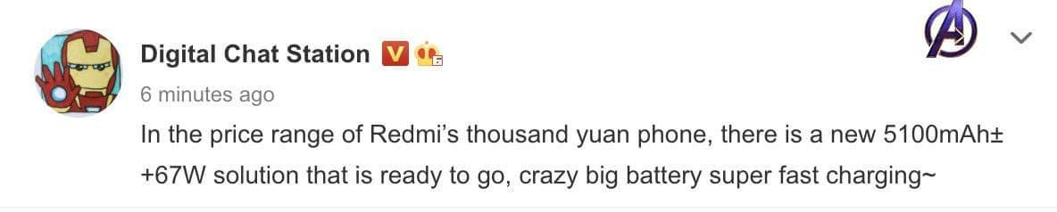 Как пишет инсайдер, известный в социальной сети Weibo под ником Digital Chat Station, Redmi готовит очередной бюджетный смартфон, а его особенностью станет аккумулятор большой емкости (около 5000 мА·ч) с поддержкой очень быстрой проводной зарядки – мощностью 67 Вт.