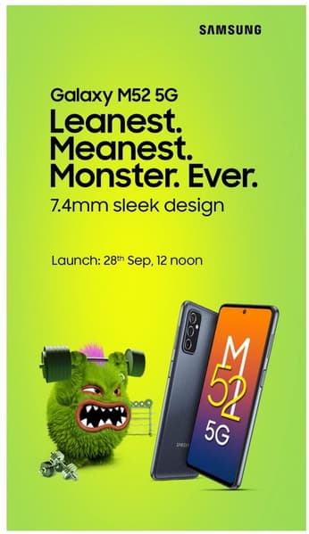 В Сети уже неоднократно всплывали подробности о смартфоне Samsung Galaxy M52 5G, а сейчас наконец-то стала известна дата официальной премьеры новинки. Она дебютирует 28 сентября в полдень, премьера состоится в Индии по местному времени.