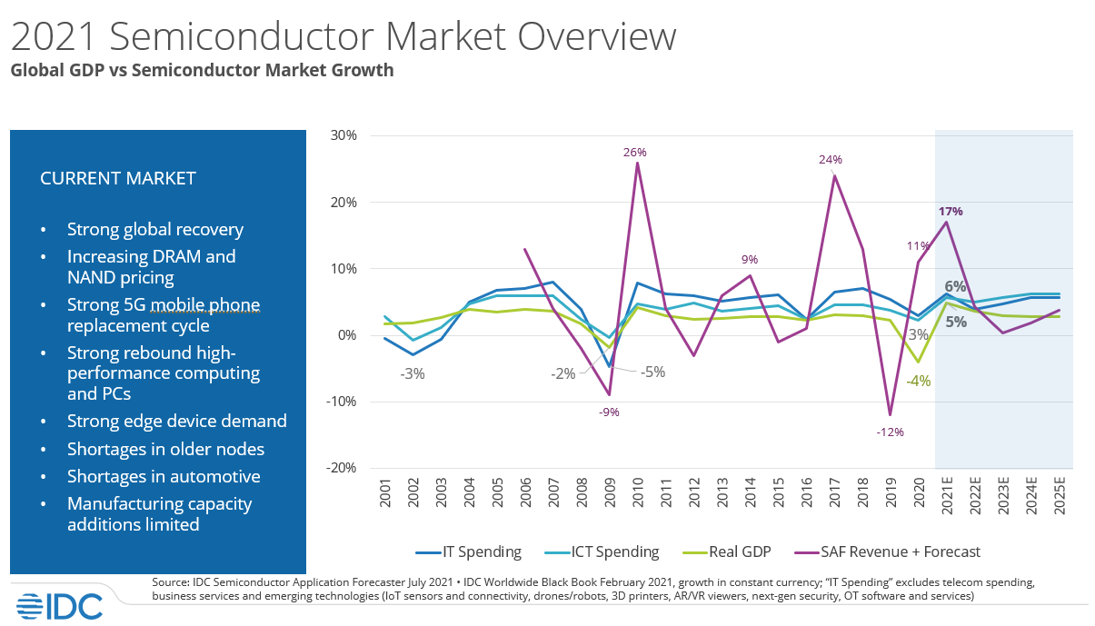 Нынешний рост рынка обеспечивается за счёт спроса на сотовые телефоны, ноутбуки, серверы, автомобили, оборудование для умного дома, игровое оборудование, носимые электронные устройства и точки доступа Wi-Fi, а также за счёт повышенных цен на память. Ожидается, что дефицит микросхем в ближайшие кварталы будет ощущаться всё меньше и меньше по мере ввода в строй новых производственных мощностей.