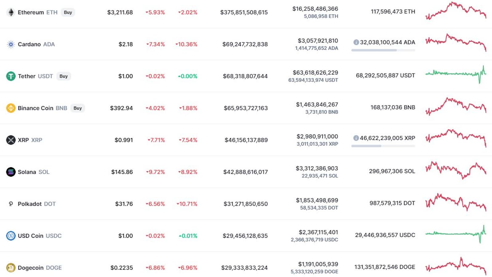 Остальные криптовалюты тоже снижаются. В топ-10 за минувшие сутки больше всего потеряли Solana (минус 9,72%, актуальная стоимость — около 145 долларов), XRP (минус 7,7%, 0,99 доллара) и Cardano (минус 7,34%, 2,18 доллара). Интересно, что любимая криптовалюта Илона Маска, Dogecoin, на пике рынка входившая в топ-5 главных криптовалют мира, сейчас оказалась на грани вылета из топ-10. За сутки она потеряла почти 7% стоимости.