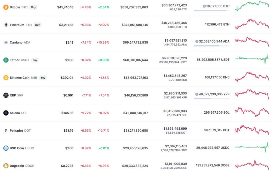 На выходных Bitcoin и Ethereum росли: Bitcoin пытался удержать отметку в 48 000 долларов, Ethereum достиг 3400 долларов. Однако пришёл понедельник, и главные криптовалюты мира упали: Bitcoin торгуется у отметки в 45 600 долларов, Ethereum — чуть дороже 3200 долларов.