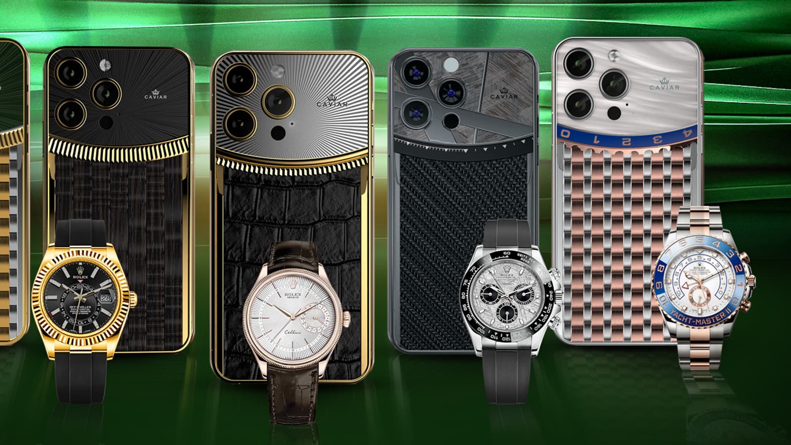 Дизайнеры и ювелиры Caviar выбрали такие модели, которые на их взгляд, отражают эстетику Rolex: Datejust 31 с оливково-зелёным циферблатом, золотые Sky-Dweller с чёрным циферблатом, космические Cosmograph Daytona, Cellini Date из розового золота и морские Yacht-Master II.