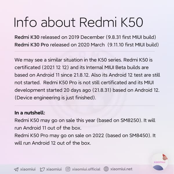 Источник полагает, что выпуск Redmi K50 может состояться уже в текущем году, причём работать он будет под управлением Android 11. В то время как Redmi K50 Pro появится в 2022 году с Android 12 из коробки.