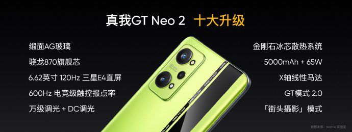 Realme GT Neo 2 построен на однокристальной платформе Qualcomm Snapdragon 870, соединённой с памятью UFS 3.1. Модем 5G присутствует. Смартфон называют одним из самых стабильных в мире из числа тех, что построены на этой однокристальной системе. Всё потому, что он получил совершенно новую систему охлаждения площадью 17 932 мм2 с термоинтерфейсом, в состав которого включена алмазная пыль. Алмазные частицы диаметром 40–50 мкм обеспечивают более быструю передачу тепла от SoC к теплорассеивающим элементам. Realme указывает, что эффективность нового «ювелирного» термоинтерфейса на 50–60% выше, чем у обычного.