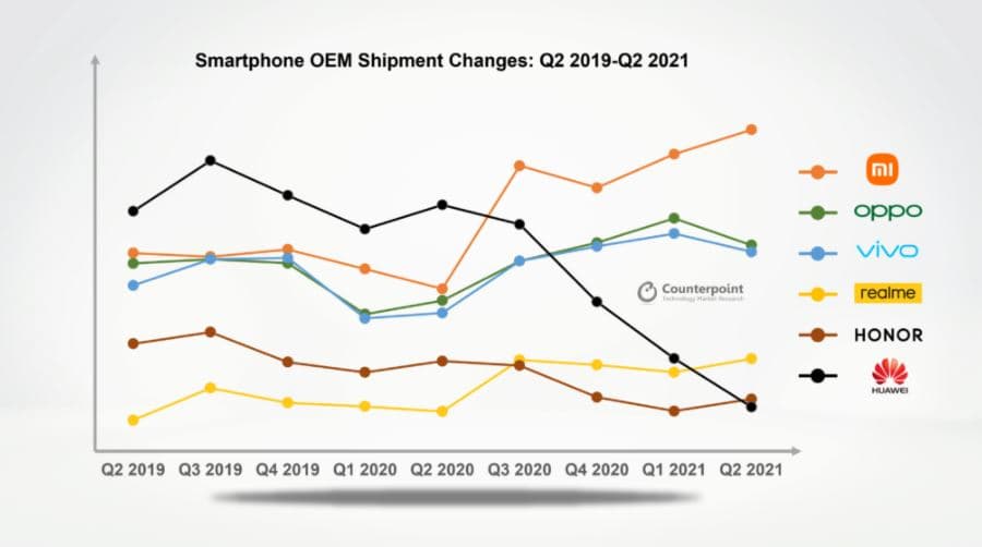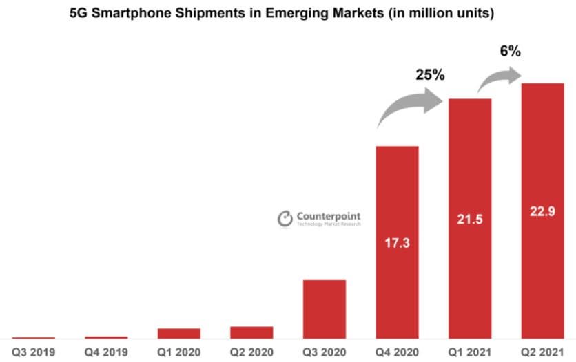 Согласно последним данным Counterpoint, поставки смартфонов 5G на развивающихся рынках во втором квартале 2021 года выросли на 6,5% по сравнению с первым кварталом, хотя общие поставки смартфонов в этих регионах сократились на 5%.