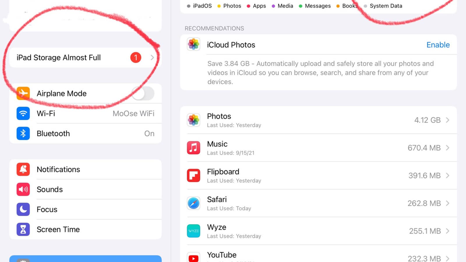 Такая же ситуация наблюдается на iPad: скриншот экрана подтверждает, что планшет информирует пользователя о том, что пространство почти закончилось, тогда как во флеш-памяти занято менее 20 ГБ из 32 ГБ. По одной из версий, файлы iOS 15 и iPadOS 15, необходимые для обновления, просто не удаляются автоматически после завершения процедуры, однако это лишь предположение.